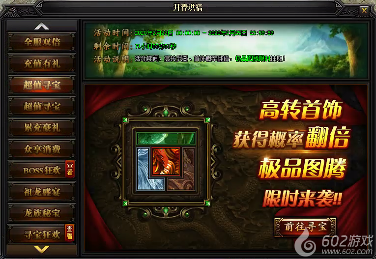 1、活动说明:活动期间,高转武器、首饰概率翻倍,极品图腾限时抽取!