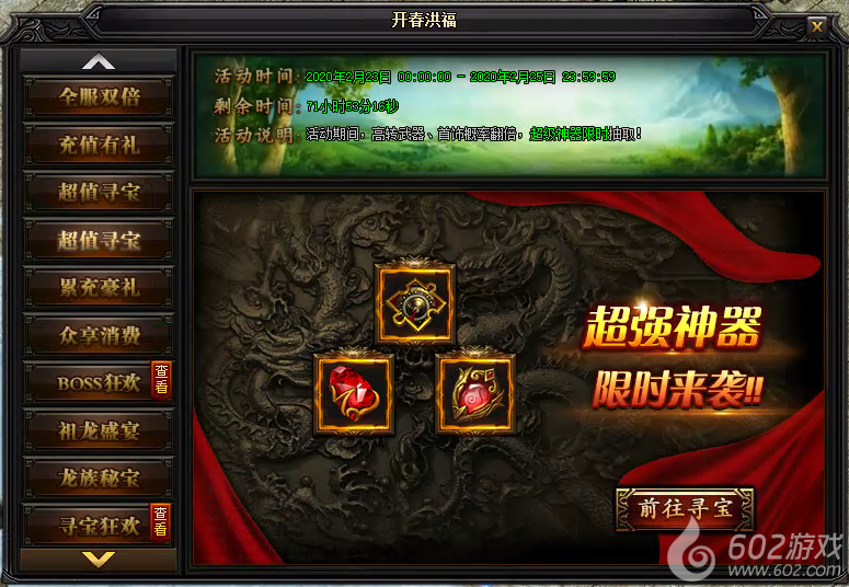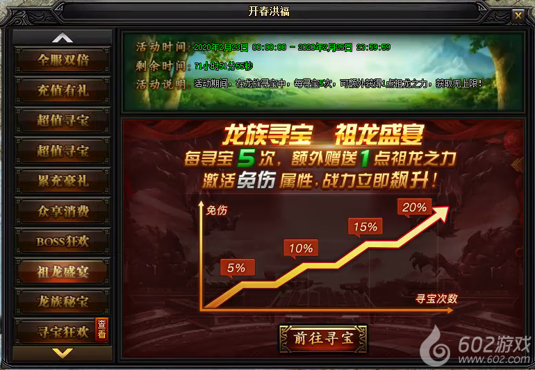 活动说明:活动期间,在龙族寻宝中,每寻宝5次,可额外获得1点祖龙之力,获取无上限!