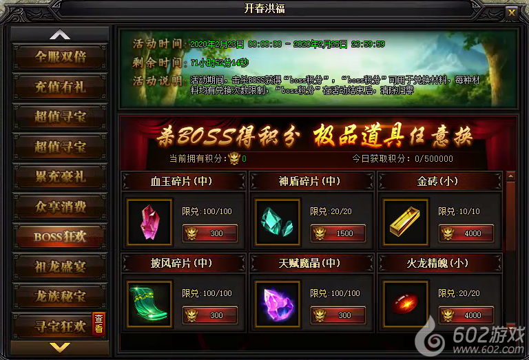 活动说明 : 活动期间内,击杀BOSS获得“boss积分”,“boss积分”可用于兑换材料,每种材料均有兑换次数限制,“boss积分”在活动结束后,清除归零