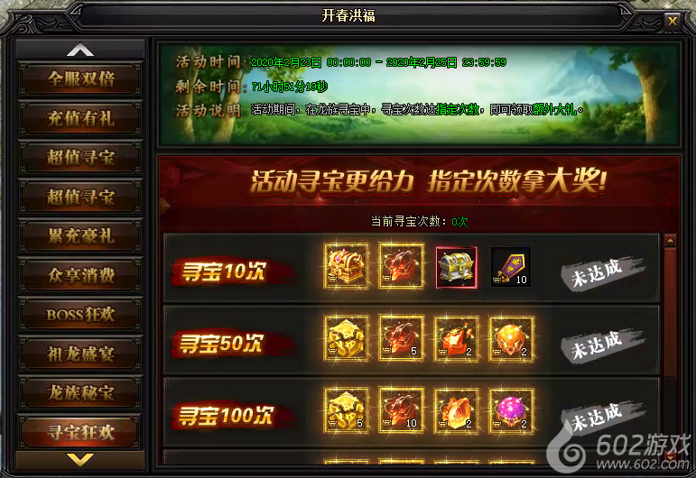 活动说明:活动期间,在龙族寻宝中,寻宝次数达指定次数,即可领取额外大礼。