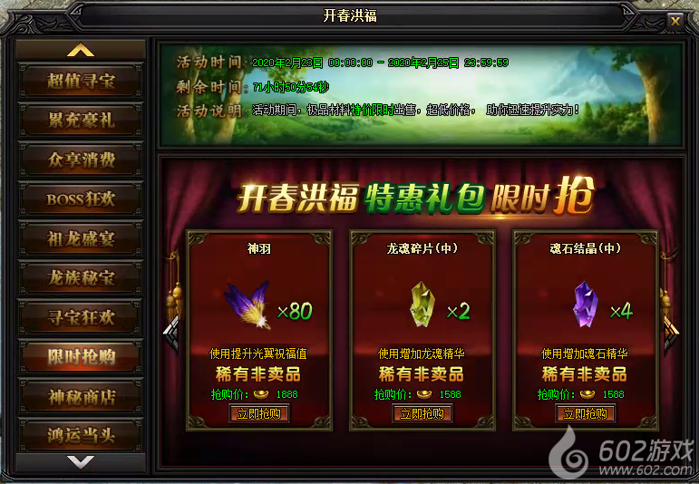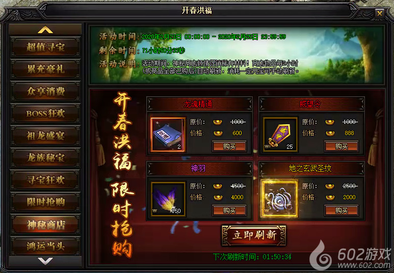 活动说明 : 活动期间,神秘商店倾情促销稀有材料!商店物品每2小时自动刷新(或全商品全部已购后),消耗一定元宝可手动刷新。