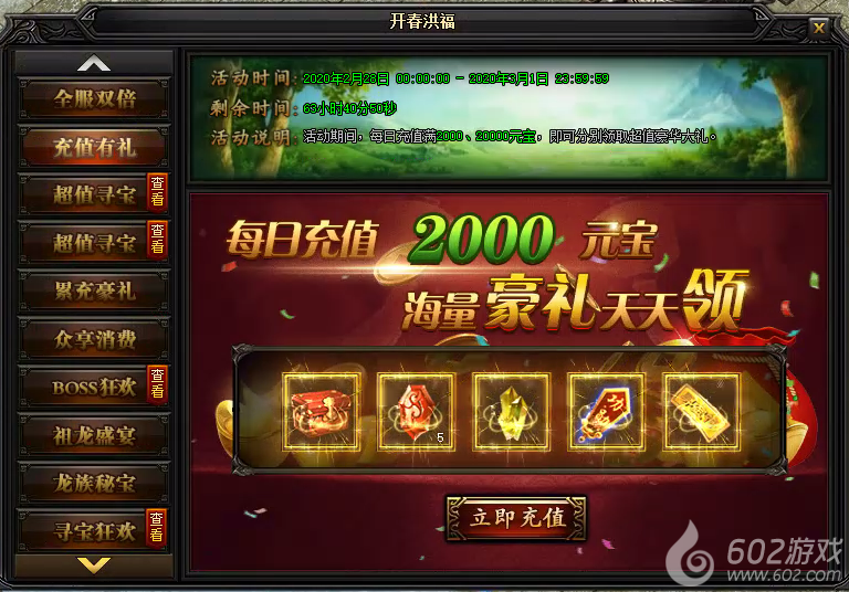 活动说明:活动期间,每日充值满2000、20000元宝!还能领取超值豪华大礼