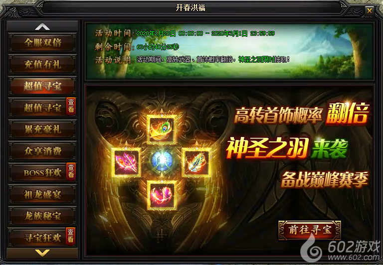 1、活动说明:活动期间,高转武器、首饰概率翻倍,神圣之羽限时抽取!