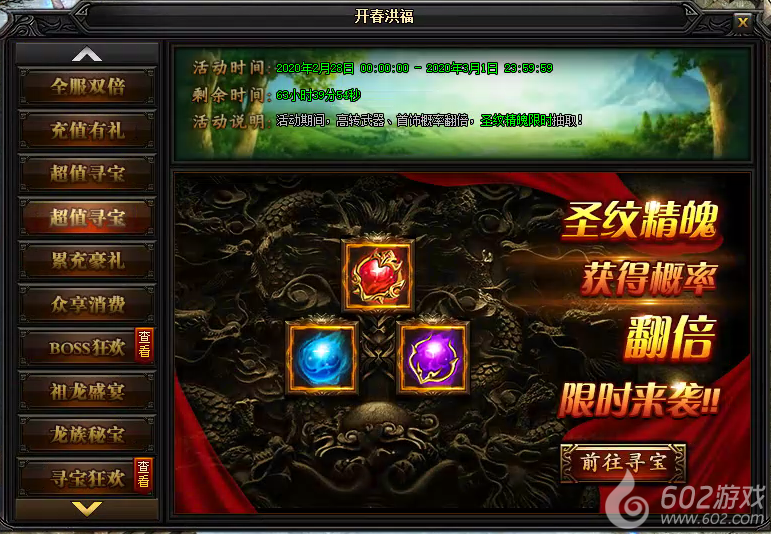 活动说明:活动期间,在龙族寻宝中,寻宝次数达指定次数,即可领取额外大礼。