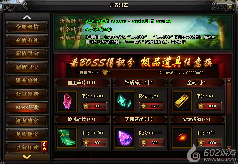 活动说明 : 活动期间内,击杀BOSS获得“boss积分”,“boss积分”可用于兑换材料,每种材料均有兑换次数限制,“boss积分”在活动结束后,清除归零