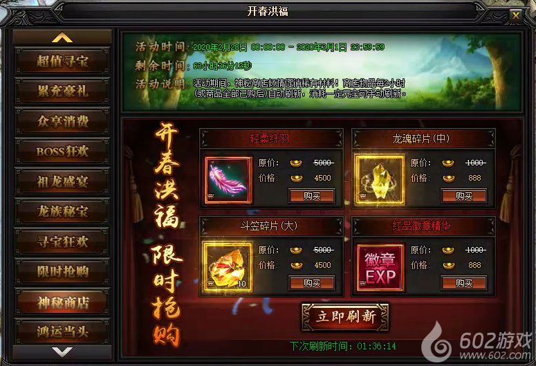 活动说明 : 活动期间,神秘商店倾情促销稀有材料!商店物品每2小时自动刷新(或全商品全部已购后),消耗一定元宝可手动刷新。