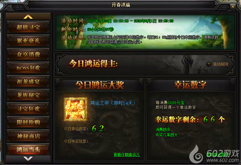 活动说明 : 玩家每消耗2688元宝即可获得一个1-100之间的幸运数字。每日21点抽取今日幸运数字,拥有该数字的玩家即可获得今日鸿运大奖。