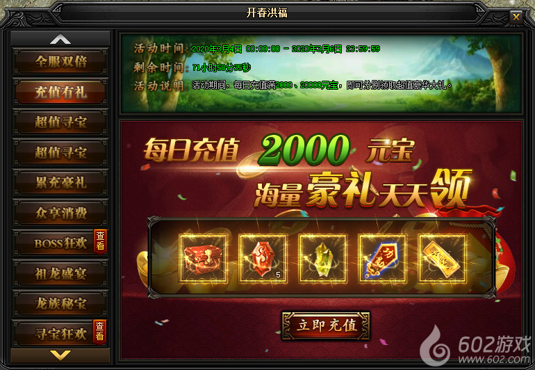 活动说明:活动期间,每日充值满2000、20000元宝!还能领取超值豪华大礼