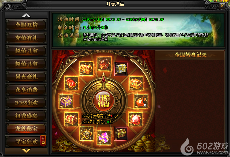 活动说明:活动期间,龙族寻宝次数达到指定次数可转动秘宝,转动转盘12次必定可领取所有秘宝转盘道具。