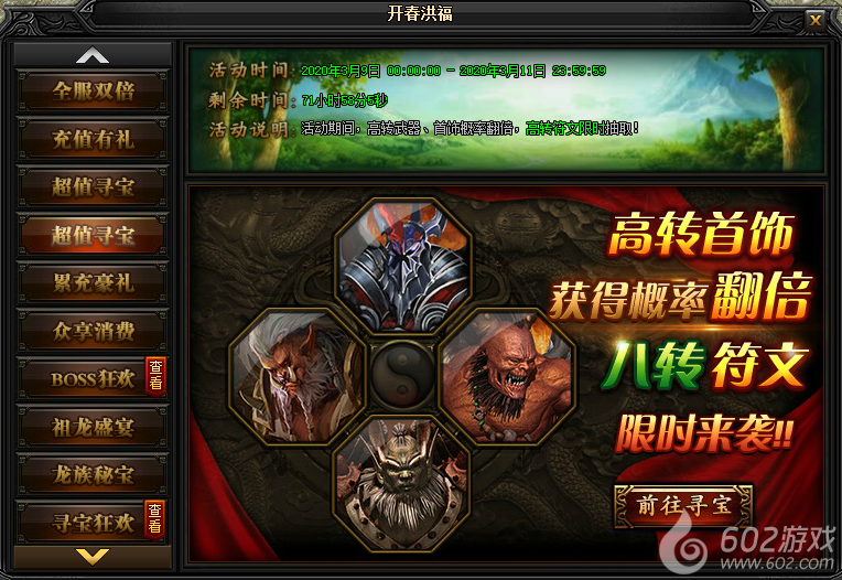 活动说明:活动期间,龙族寻宝次数达到指定次数可转动秘宝,转动转盘12次必定可领取所有秘宝转盘道具。