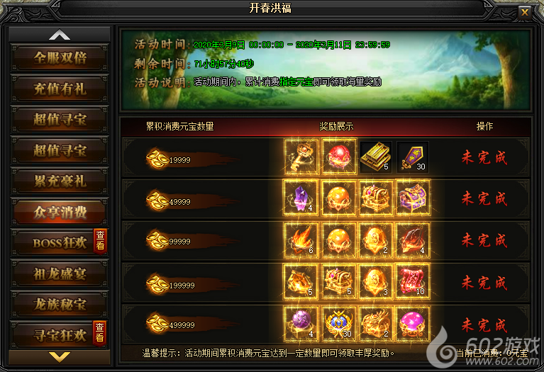 活动说明 : 活动期间内,累计消费指定元宝即可领取海量奖励