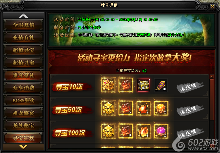 活动说明:活动期间,在龙族寻宝中,寻宝次数达指定次数,即可领取额外大礼。