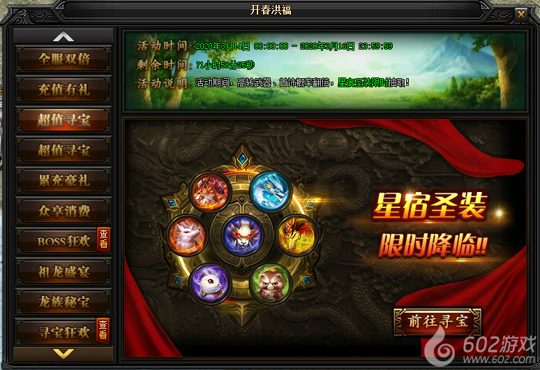 活动说明:活动期间,龙族寻宝次数达到指定次数可转动秘宝,转动转盘12次必定可领取所有秘宝转盘道具。