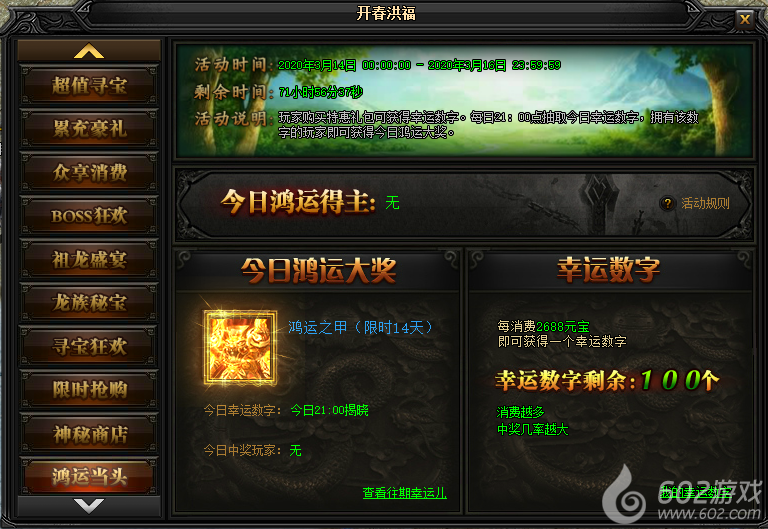 活动说明 : 玩家每消耗2688元宝即可获得一个1-100之间的幸运数字。每日21点抽取今日幸运数字,拥有该数字的玩家即可获得今日鸿运大奖。