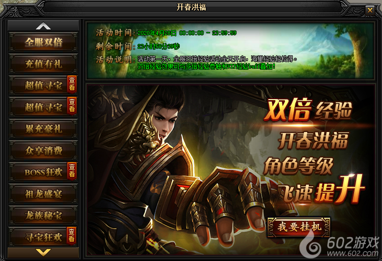 活动说明:活动第一天,全服双倍经验活动全天开启,海量经验轻松得。双倍经验效果可与多倍经验卷轴和VIP经验buff叠加!