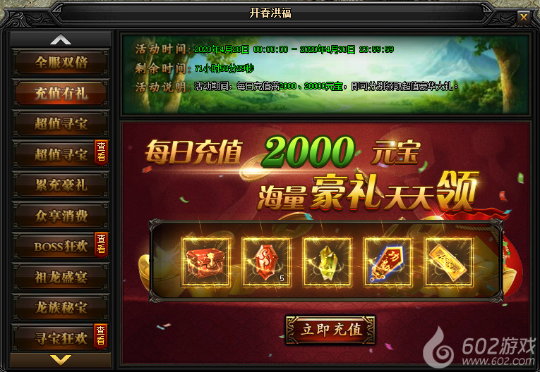 活动说明:活动期间,每日充值满2000、20000元宝!还能领取超值豪华大礼