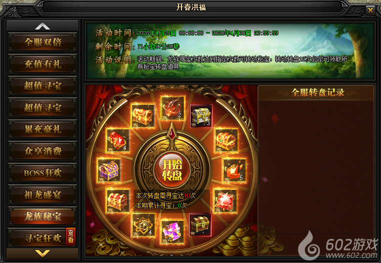 活动说明:活动期间,龙族寻宝次数达到指定次数可转动秘宝,转动转盘12次必定可领取所有秘宝转盘道具。