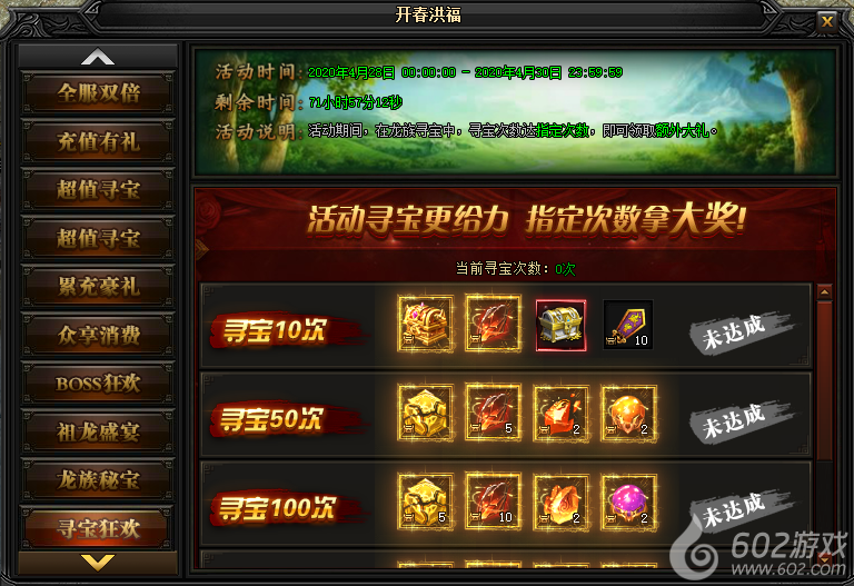 活动说明:活动期间,在龙族寻宝中,寻宝次数达指定次数,即可领取额外大礼。