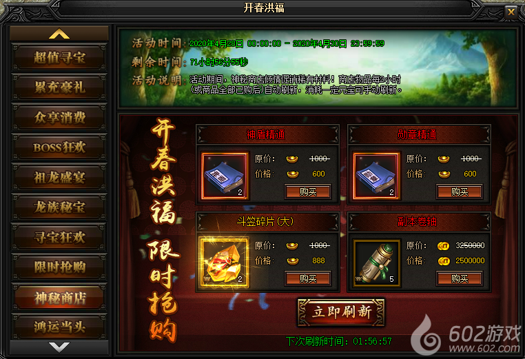 活动说明 : 活动期间,神秘商店倾情促销稀有材料!商店物品每2小时自动刷新(或全商品全部已购后),消耗一定元宝可手动刷新。