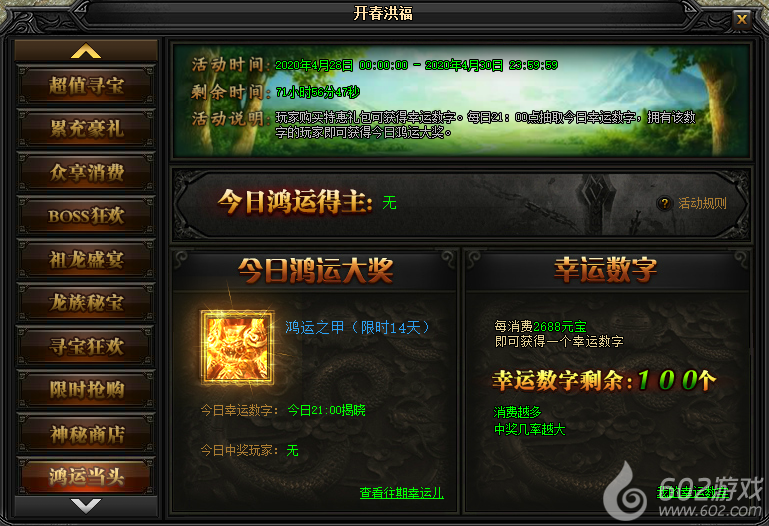 活动说明 : 玩家每消耗2688元宝即可获得一个1-100之间的幸运数字。每日21点抽取今日幸运数字,拥有该数字的玩家即可获得今日鸿运大奖。