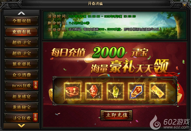 活动说明:活动期间,每日充值满2000、20000元宝!还能领取超值豪华大礼