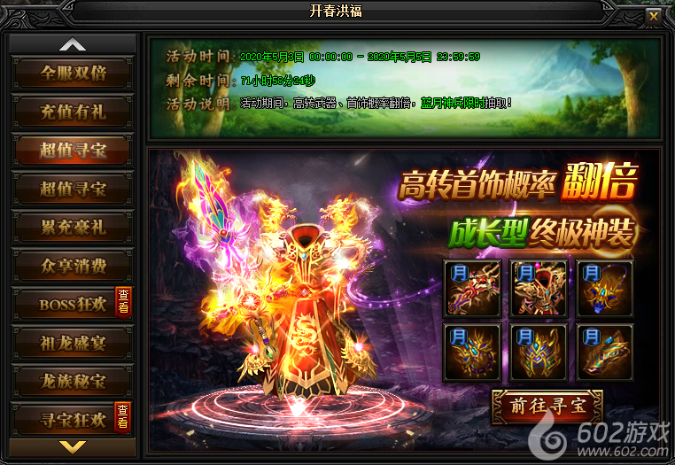 活动说明:活动期间,在龙族寻宝中,每寻宝5次,可额外获得1点祖龙之力,获取无上限!