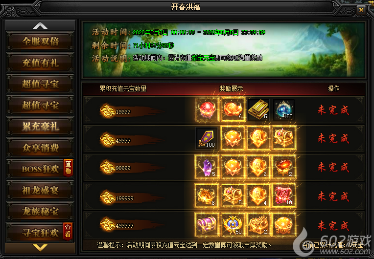 活动说明 : 活动期间内,累计充值指定元宝即可领取海量奖励