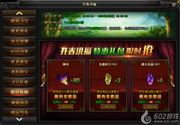 活动说明:活动期间,极品材料特价限时出售,超低价格,助你迅速提升实力!