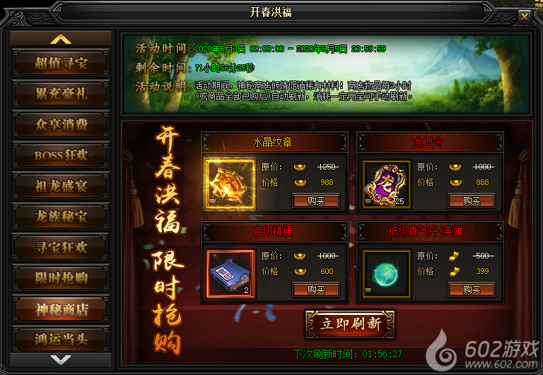 活动说明 : 活动期间,神秘商店倾情促销稀有材料!商店物品每2小时自动刷新(或全商品全部已购后),消耗一定元宝可手动刷新。