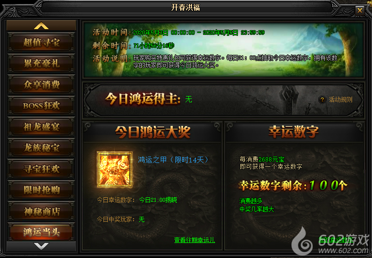 活动说明 : 玩家每消耗2688元宝即可获得一个1-100之间的幸运数字。每日21点抽取今日幸运数字,拥有该数字的玩家即可获得今日鸿运大奖。