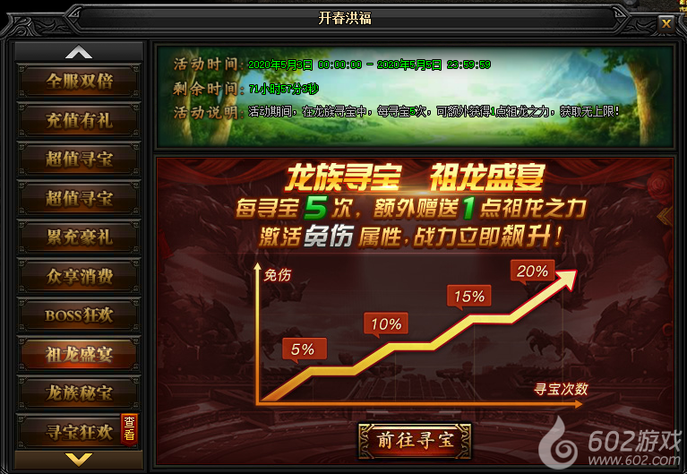 活动说明:活动期间,在龙族寻宝中,每寻宝5次,可额外获得1点祖龙之力,获取无上限!