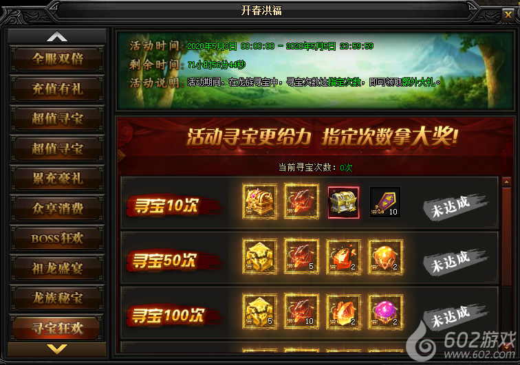 活动说明:活动期间,在龙族寻宝中,寻宝次数达指定次数,即可领取额外大礼。