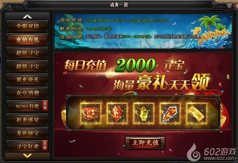 活动说明:活动期间,每日充值满2000、20000元宝!还能领取超值豪华大礼