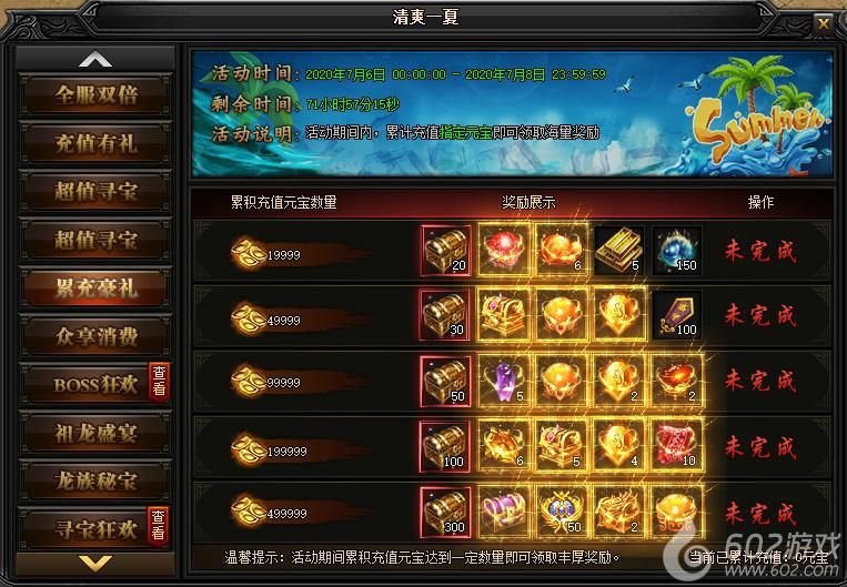 活动说明 : 活动期间内,累计充值指定元宝即可领取海量奖励