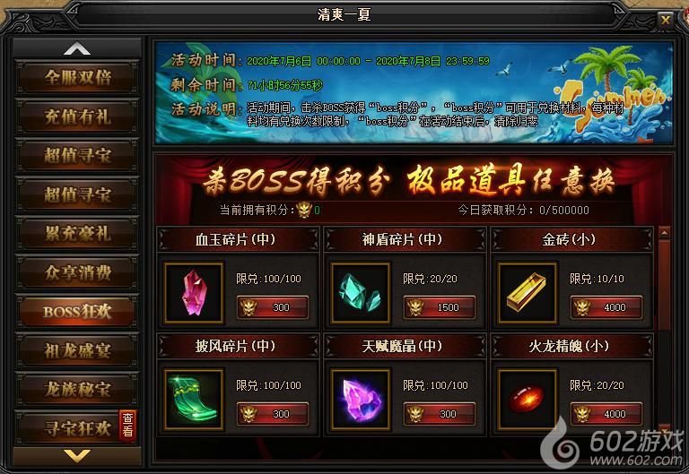 活动说明 : 活动期间内,击杀BOSS获得“boss积分”,“boss积分”可用于兑换材料,每种材料均有兑换次数限制,“boss积分”在活动结束后,清除归零
