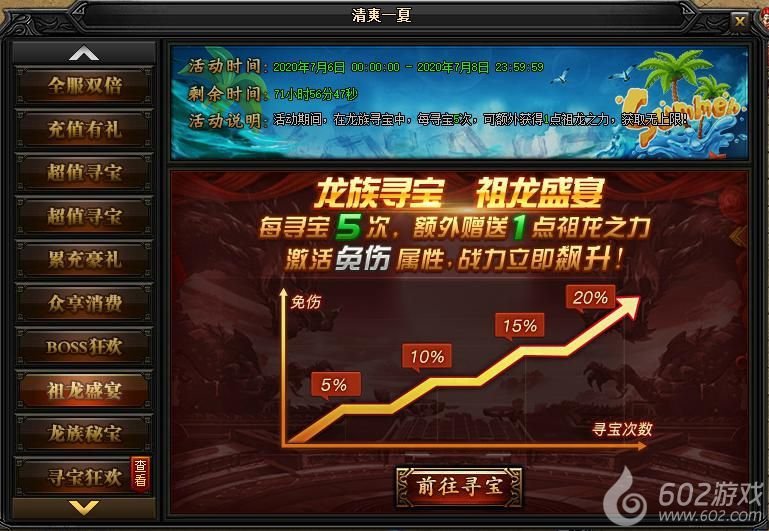 活动说明:活动期间,在龙族寻宝中,每寻宝5次,可额外获得1点祖龙之力,获取无上限!