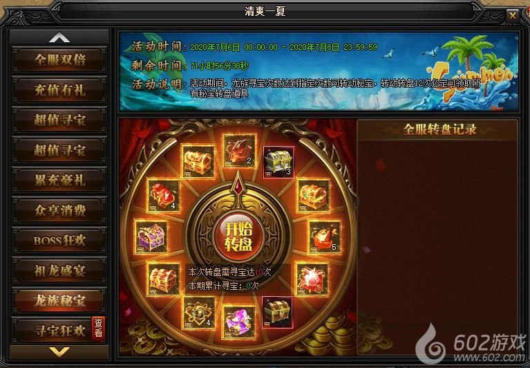 活动说明:活动期间,龙族寻宝次数达到指定次数可转动秘宝,转动转盘12次必定可领取所有秘宝转盘道具。