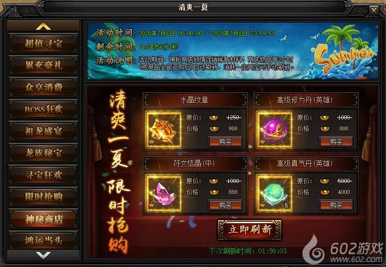 活动说明 : 活动期间,神秘商店倾情促销稀有材料!商店物品每2小时自动刷新(或全商品全部已购后),消耗一定元宝可手动刷新。