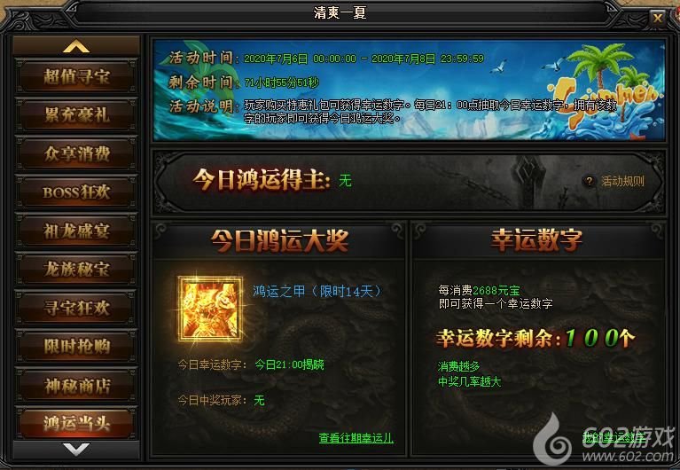 活动说明 : 玩家每消耗2688元宝即可获得一个1-100之间的幸运数字。每日21点抽取今日幸运数字,拥有该数字的玩家即可获得今日鸿运大奖。